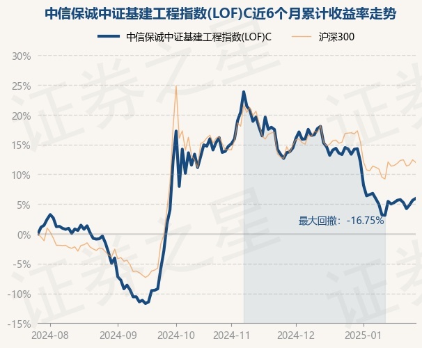 本站消息,1月27日,中信保诚中证基建工程指数(LOF)C最新单位净值为0.692元,累计净值为0.692元,较前一交易日上涨0.29%。历史数据显示该基金近1个月下跌7.24%,近3个月下跌8.15%,近6个月上涨5.94%,近1年上涨1.29%。该基金近6个月的累计收益率走势如下图:
